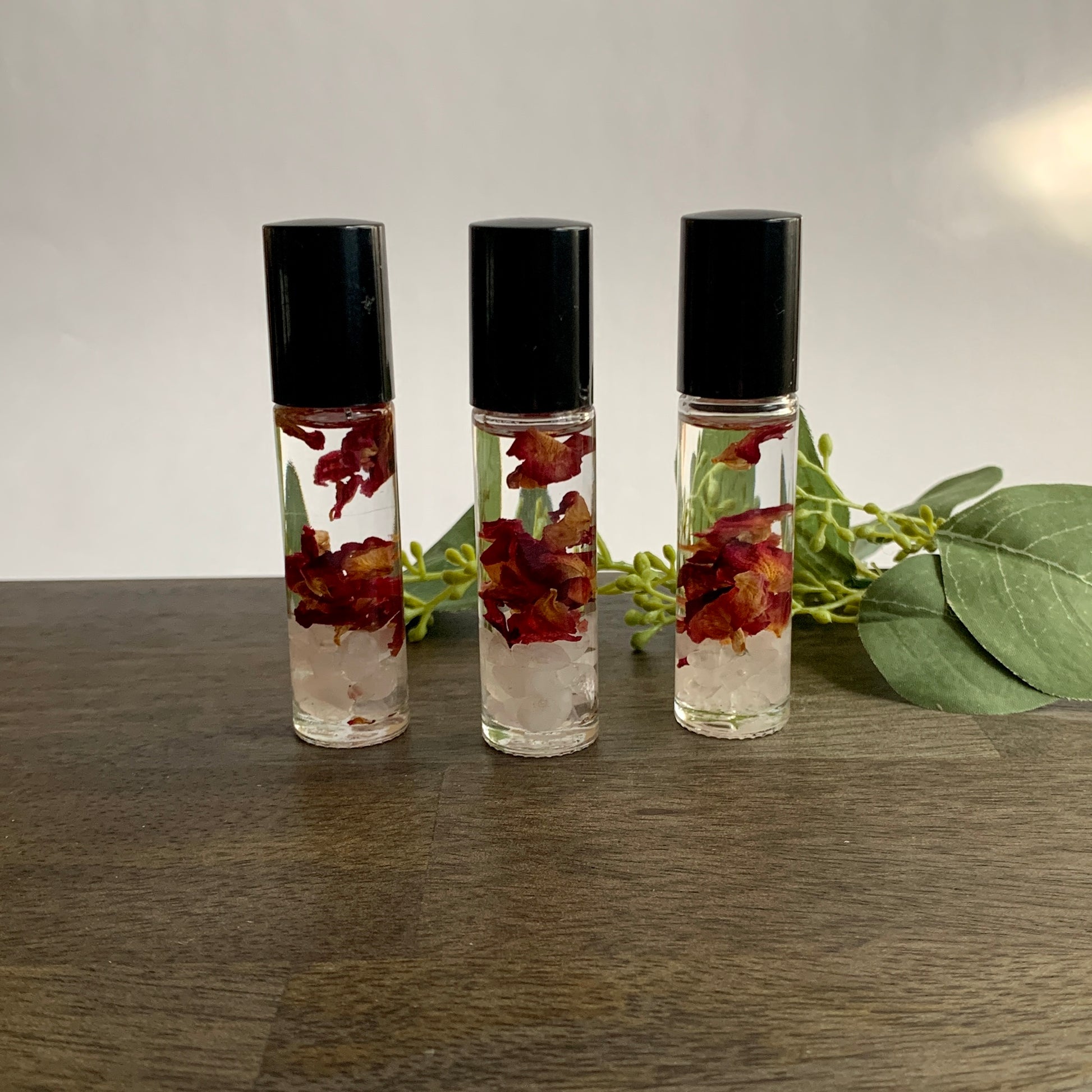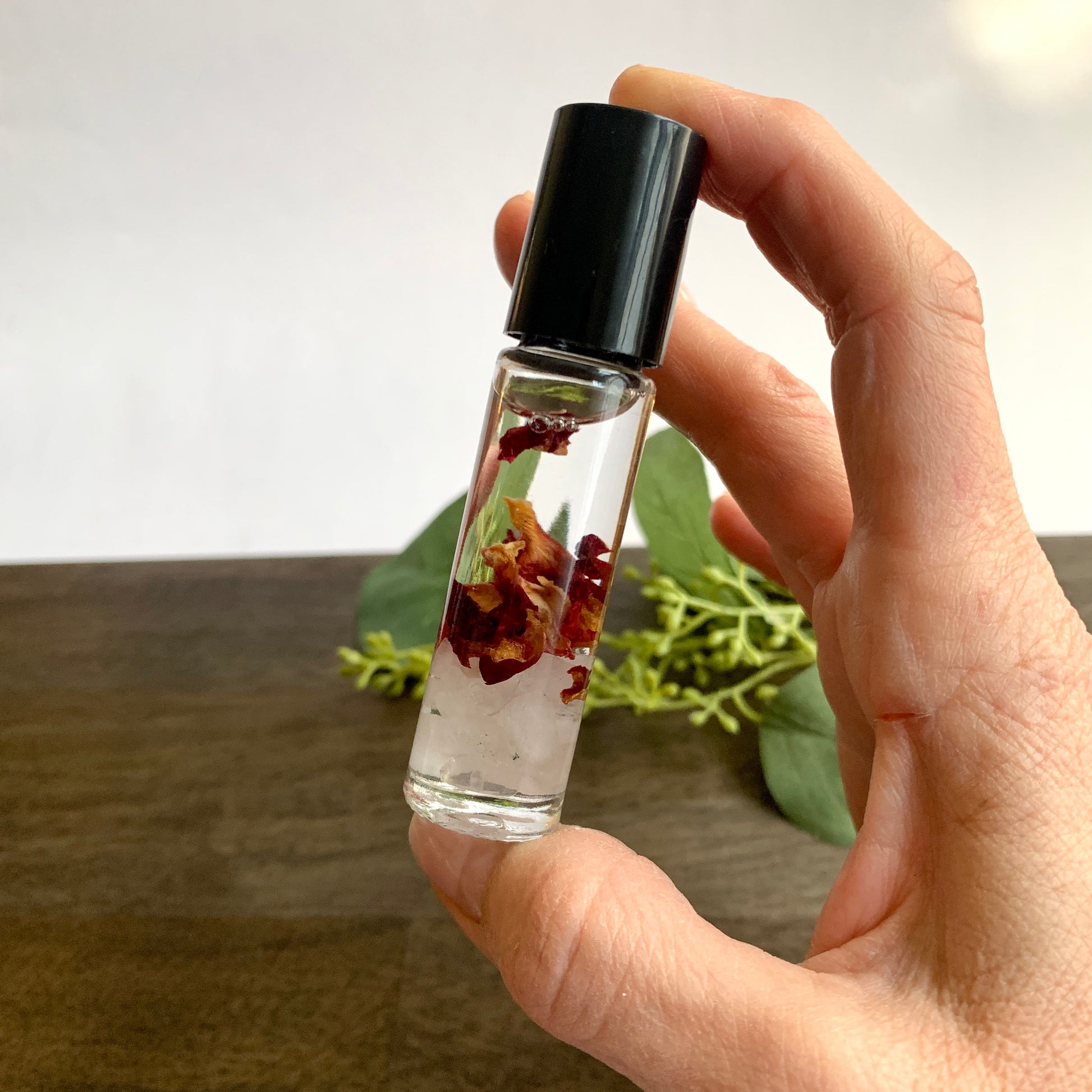 Natural Rose Aromatherapy Roll-On Perfume with Rose Petals & Rose Quartz Crystal Chips